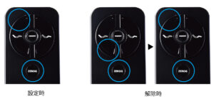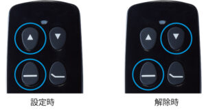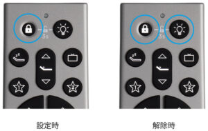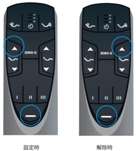 解除方法:頭部リクライニングの下降ボタンとゼロジーボタンを同時に3秒間長押しすると、リモコンのボタンライトが1回点滅する。次に頭部リクライニングの上昇ボタンとゼロジーボタンをリモコンのボタンライトが2回点滅するまで長押しする。